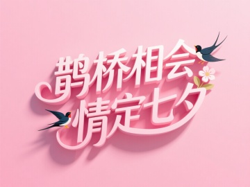 梦幻插画风,大字“七夕”悬浮夜空,星光闪烁,双燕飞舞,桥连云端,浪漫节日氛围。