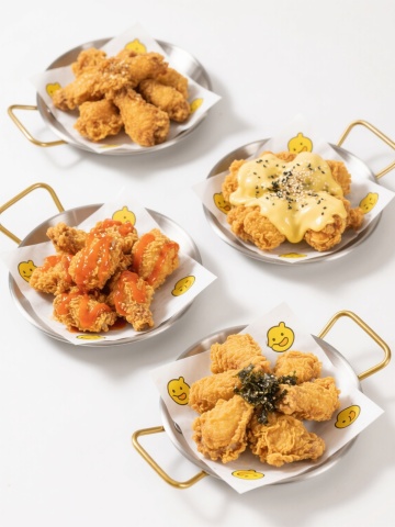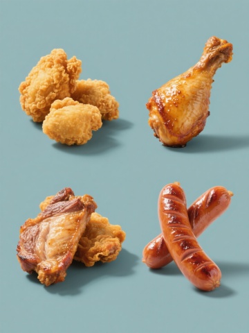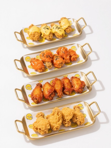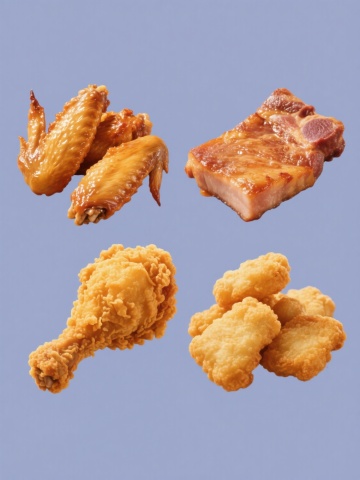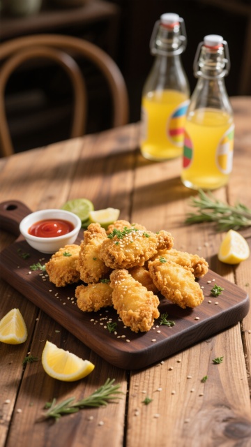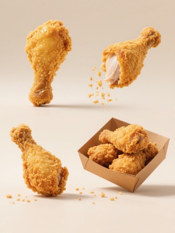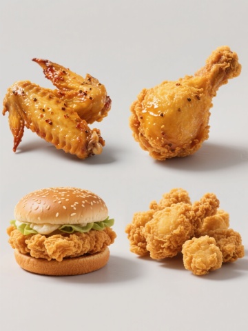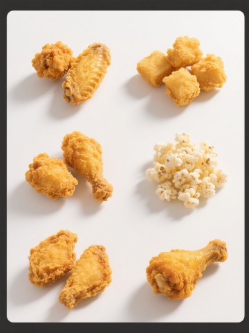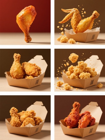美食摄影风格,俯拍构图,金属托盘配红色把手,内垫复古报纸图案油纸,中央摆放炸鸡块、炸鸡腿、金黄薯条、芝麻球,搭配白色双格调味碟(番茄酱与辣椒粉),右侧可见盛有红色汤底米粉的金属锅,左侧有小金属盘装红色酱料与辣椒粉,整体暖色调,高光突出食物酥脆质感,阴影自然柔和,光线明亮营造食欲感,保持油炸食品核心元素与餐具搭配,变换为更具现代感的几何摆盘样式,增强各食物间的空间层次感与色彩对比。
