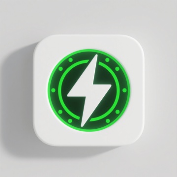 一个简洁的数字图标设计,白色背景,中央是一个白色的闪电符号,周围环绕着一个绿色的圆环,圆环上有绿色的圆点,整体呈现出一种科技感和能量感。