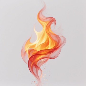 一张在纯白色背景上呈现的火焰图像,火焰以流畅飘逸的姿态向上舞动,核心区域为明亮的橙黄色,向外过渡为温暖的橙红色,边缘带有轻盈的红色烟雾效果,整体呈现出动态的流动感和半透明的质感,火焰的造型呈现出自然而富有动感的曲线形态,光影过渡柔和,高光部分明亮耀眼,底部有细微的火星散落,营造出逼真而富有艺术感的燃烧效果。