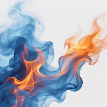 两团火焰元素,蓝色与橙色渐变交融,烟雾缭绕,动感飘逸,透明质感,白色背景,高对比度,精细的烟雾纹理,流动的形态,火焰的动态效果,色彩鲜艳,光影效果,烟雾粒子,艺术化处理,抽象火焰,蓝色火焰与橙色火焰交织,火焰的层次感,烟雾的轻盈感,火焰的燃烧效果,渐变色彩过渡自然,烟雾的扩散效果,火焰的形态优美,烟雾的细节丰富,整体画面简洁而富有动感。