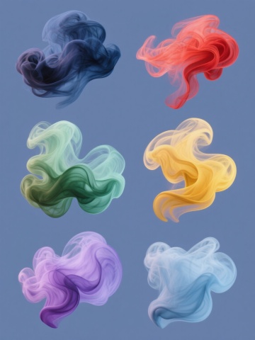 一组由六个不同造型和颜色的抽象烟雾元素组成的系列素材集合,每个烟雾元素保持原图的写实摄影风格、细腻的烟雾纹理、流动感和不规则的卷曲形态,均以纯色背景呈现,整体色彩各异(如深蓝、火红、翠绿、明黄、紫色、浅蓝),所有元素规整排布,形成协调统一的视觉系列,每个烟雾元素具有清晰的边缘和层次,光影效果自然,展现出烟雾轻盈缥缈的质感。