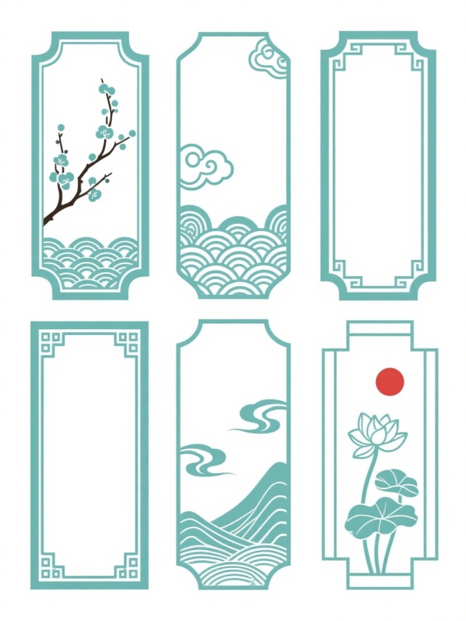 中国传统风格系列装饰边框集合,6个不同造型的竖长方形边框规整排布成2行3列,每个边框轮廓线条精细流畅,内部装饰元素各异——包含波浪纹、梅花枝、祥云纹、荷花、红日远山等传统吉祥图案,整体采用纯色背景(非白色),色彩变换为青绿色调,保持原有的线条艺术风格和简约设计感,无文字内容,每个边框造型独特又统一于整体中式美学体系,适合作为装饰或信息载体使用。