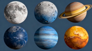 6个高度写实的星球在纯色背景上以规整网格排布的系列集合,每个星球保持与原图一致的3D质感、细腻表面纹理和光影效果但具有不同色调:地球呈现蓝白相间的海洋与云层覆盖,月球为灰白陨石坑表面,太阳是炽热的橙黄色光球,土星拥有棕黄色条纹与光环,火星呈红棕色地表,天王星为青蓝色冰巨星,所有星球均为球形且表面细节丰富,整体风格统一且色彩鲜明。