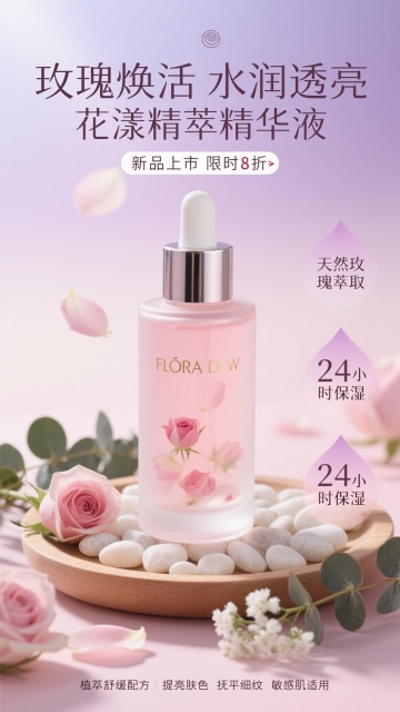 特写镜头,磨砂质感的圆柱形玻璃瓶中装着淡粉色的玫瑰精华液,搭配银色金属按压泵头和淡金色品牌标识"FLORA DEW",瓶身半透明设计能看见内部悬浮的玫瑰花瓣,放置在铺满白色鹅卵石的浅木托盘上,周围点缀着新鲜玫瑰花瓣、尤加利叶和白色满天星,背景为渐变的淡紫色到淡粉色,光线柔和如清晨的薄雾。海报上方有"玫瑰焕活 水润透亮 花漾精萃精华液"及"新品上市限时8折"的文字,右下角有两个水滴形标签分别标注"天然玫瑰萃取"和"24小时保湿",底部配有"植萃舒缓配方""提亮肤色 抚平细纹""敏感肌适用"的产品功效描述。