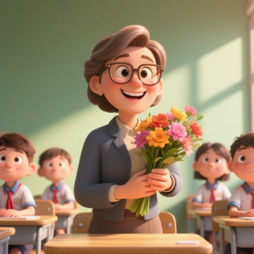 温馨软3D风,卡通教师手捧鲜花与贺卡,教室场景洋溢节日祝福氛围。