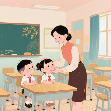 温馨的教室里,老师轻抚学生的脸颊,插画风设计展现浓浓师生情。
