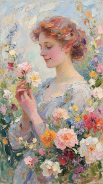 印象派风格油画,秋日午后的宁静山谷溪流,厚重的油彩笔触,浓烈丰富的色彩层次,天空呈现渐变的橙红与粉紫交织的晚霞,云朵边缘镶着金边,山谷两侧是金黄与赭红相间的茂密树林,溪流水面倒映着绚烂的天色与岸边的秋叶,近岸点缀着橙色和红色的小野菊,光线柔和温暖,营造出浪漫而富有诗意的氛围,整体构图采用三分法,视觉引导线由溪流延伸至远方的山谷尽头,画面充满生机与自然的美感,色彩明快饱和,笔触奔放富有动感,光影效果强烈,细节丰富。