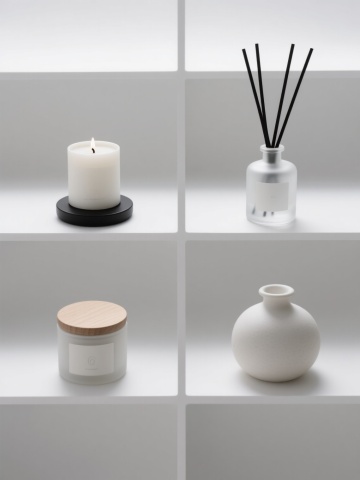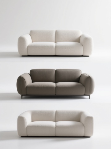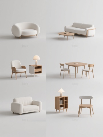极简现代风格家居产品展示海报,纯白色背景,四个等大的规整排布的素材区域,每个区域分别展示一件不同的简约现代风格家具(如舒适的米白色单人沙发配浅棕色搭毯、金属支架弧形白色落地灯、圆形白色毛绒地毯、翻开的杂志),整体采用柔和的自然光照明,高光柔和,阴影细腻自然,物体边缘清晰,材质表现真实(布艺的柔软感、金属的光滑感、毛绒的蓬松感),无任何文字、logo或水印,画面干净整洁,信息传达直接,视觉层级清晰,符合现代简约的设计美学。