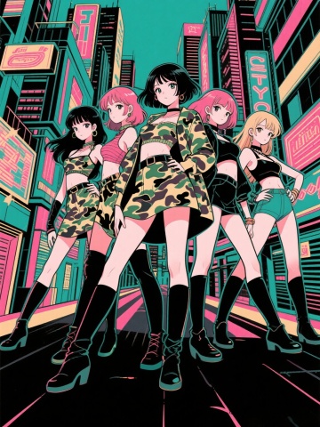 三个酷男孩,全身像,波普艺术风格,街舞动作,穿着潮服,时尚感强,表情夸张,肢体动作夸张,清晰的插图,大胆的线条,抽象涂鸦风格与前卫潮流元素碰撞,融合Becca Doodlefly、Sandara Tang和天野喜孝的艺术特征