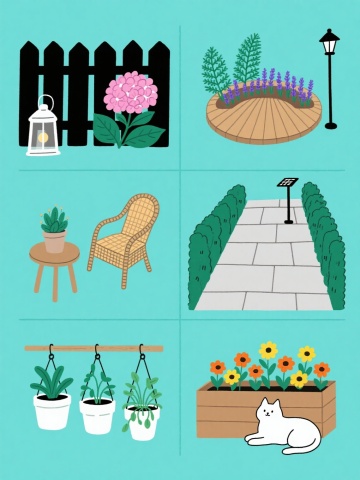 纯色背景,简笔画风格,系列素材集合,六个完全不同的元素内容,规整排布,每个元素保持园艺/户外生活类目;第一个元素:黑色栅栏后探出几朵粉色绣球花,配一个白色小灯笼;第二个元素:圆形木质露台,中央一把藤编休闲椅,旁边小桌上放着一个多肉盆栽;第三个元素:曲线形花坛,里面种满紫色薰衣草,边缘点缀三株绿色蕨类;第四个元素:方形石板小径,两旁是修剪整齐的冬青绿篱,尽头一个太阳能庭院灯;第五个元素:悬挂式花盆组合,三个不同大小的白色陶盆,分别种着绿萝、常春藤和吊兰;第六个元素:六边形木质花箱,里面混种着黄色雏菊和橙色万寿菊,花箱旁卧着一只简笔画风格的白色小猫;整体采用明快的蓝绿色调背景,线条简洁流畅,色彩平涂无渐变,元素间间距均匀,排列成两行三列的规整网格。