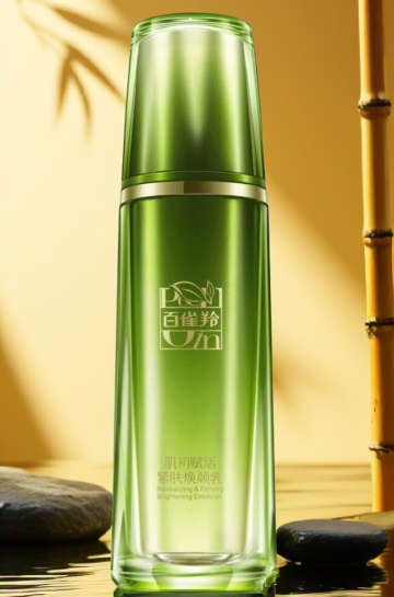清新玻璃瓶设计,简约现代,融入国潮元素,竹影映衬,营造舒适轻拟物风。