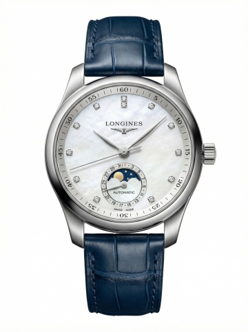 特写镜头下的古董机械钟表,浅色背景(柔和的米白色或浅灰色),钟表主体结构保持不变,表盘采用深蓝色与银色的配色方案,罗马数字时标为银色,表盘中央为深蓝色网格纹,边缘装饰有银色的卷草花纹,指针为银色金属材质,表面有细腻的金属光泽和精密的齿轮纹理,整体画面30%留白,光线从斜上方照射,形成柔和的阴影和高光对比,营造出优雅、精致而略带现代感的氛围。