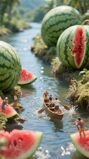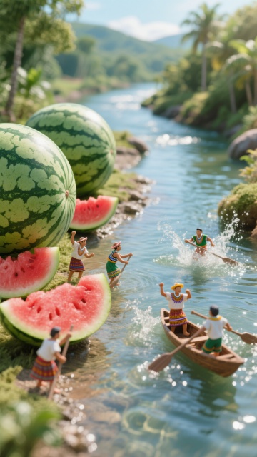 清新水彩风,微缩艺术展现超现实主义卡通感,西瓜与小人共舞,夏日清凉。#五彩斑斓的夏天