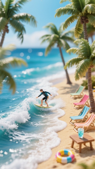 3D微缩艺术风,液态海浪与舒适沙滩,清新色彩营造夏日度假氛围。