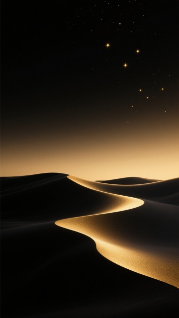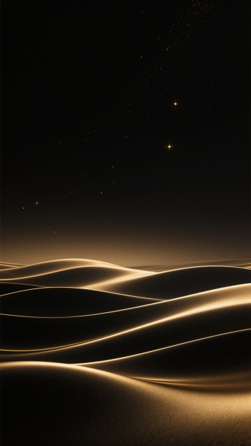 深邃漆黑的背景从顶部到底部呈现由深黑渐变为暗金色的平滑过渡,营造出神秘而奢华的氛围,画面中点缀着少量细小的金色光点如同遥远的星辰增添了空间的深邃感,底部设计有流畅起伏的金色波浪线条,线条边缘带有柔和的高光呈现出细腻的金属光泽质感,整体构图简洁大气,光影过渡自然,色调统一和谐,充满高级感与静谧的视觉张力,类似沙漠沙丘的自然曲线,渐变色彩如同黎明或黄昏的天空,金色星点与流畅线条共同构建出平衡而富有韵律的画面,视觉层级清晰,信息传达效率高,具有现代简约的设计感。