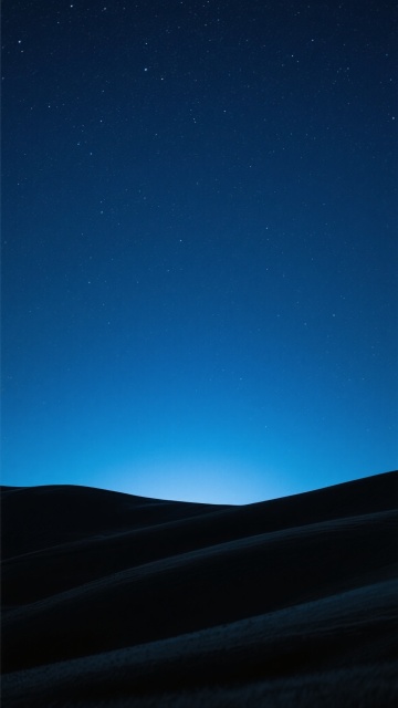 深邃的夜空,无数星星闪烁,形成渐变的深蓝色调,从地平线向上逐渐加深,地平线处有柔和的蓝色光晕,下方是起伏的黑色山丘轮廓,整体画面静谧而神秘,具有极简的自然景观风格和柔和的光影过渡效果。