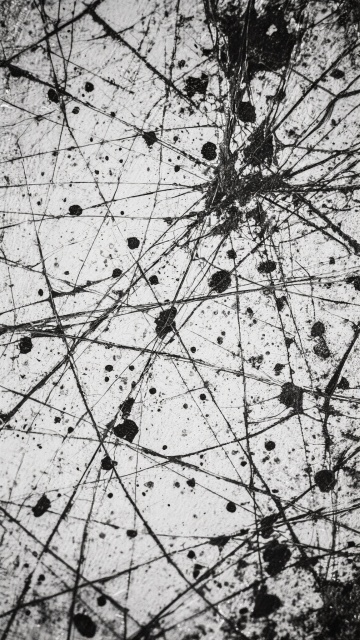 纯黑背景上布满不规则的白色刮痕纹理,刮痕粗细不一,走向杂乱交错,部分区域形成密集的白色斑驳效果,整体呈现出强烈的粗糙质感和复古破损风格,刮痕细节在保持随机分布的基础上,增加了更多长短不一的线条交织和局部小块状的白色磨损痕迹。