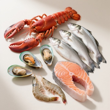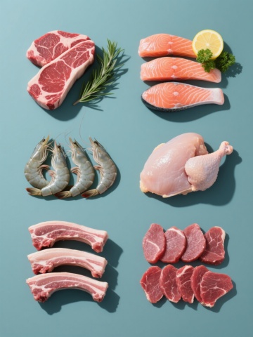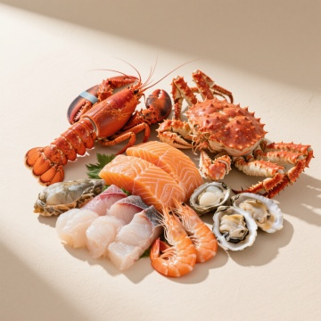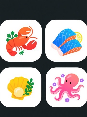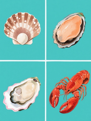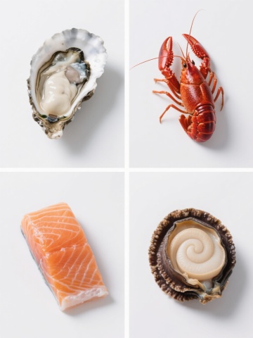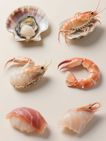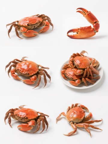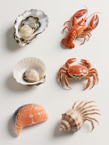 六个海鲜元素规整排布的系列素材集合,保持与原图一致的高清晰摄影风格和纯色背景,包含蒸熟的橙色大闸蟹、完整的清蒸龙虾、带壳的新鲜鲍鱼、弯曲的鲜活大虾、开口的饱满扇贝和去壳的肥美白灼虾,每个元素均呈现出自然的食材质感和真实的色彩,整体构图对称平衡,元素间距均匀,适合作为系列海鲜产品展示素材。