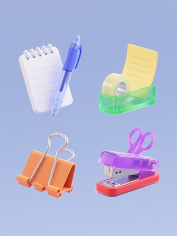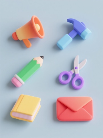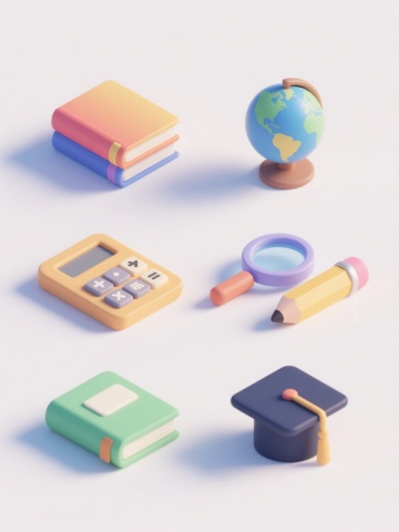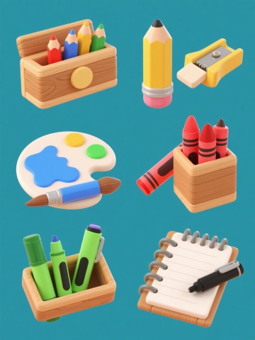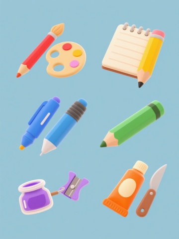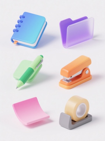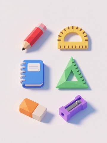 一系列6个完全不同的卡通风格文具图标,保持与示例一致的3D立体效果、圆润边角、柔和渐变色彩和简约造型,包含铅笔、笔记本、橡皮、尺子、卷笔刀和彩色马克笔,每个文具独立呈现,规整排列在纯色背景上,保持统一的光影处理和可爱的设计感。