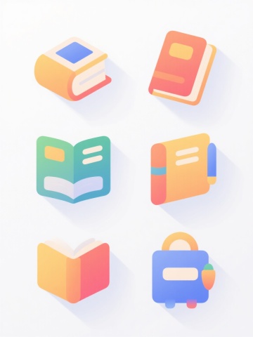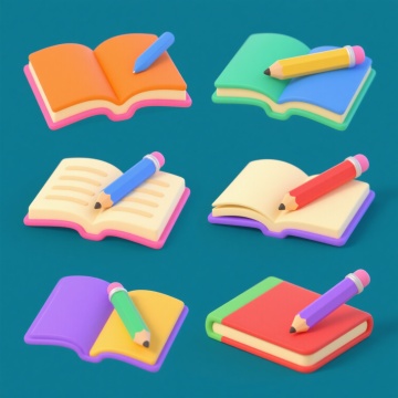一套6个不同造型的卡通风格系列素材集合,规整排布,每个素材均为纯色背景,保持原插画的3D立体效果、圆润可爱的造型风格、平滑的渐变色彩过渡和柔和的光影处理。元素内容包括一本翻开的橙色封面书籍,书页为米黄色,书脊为粉红色,以及一支带有蓝色笔身和粉色笔帽的铅笔斜放在书页上。6个造型在保持核心元素不变的前提下,通过改变书籍的开合角度、铅笔的摆放姿态(如笔尖朝左、笔尖朝右、铅笔横放、铅笔斜插书页、铅笔靠在书脊、铅笔笔尖朝上)来形成变化,每个素材的整体色彩方案各不相同(如方案一:橙色书+蓝色笔+粉色背景;方案二:蓝色书+黄色笔+绿色背景;方案三:绿色书+紫色笔+橙色背景;方案四:黄色书+红色笔+蓝色背景;方案五:紫色书+绿色笔+黄色背景;方案六:红色书+绿色笔+紫色背景),所有元素边缘清晰,无模糊,整体呈现出统一的卡通插画风格和温馨可爱的氛围。