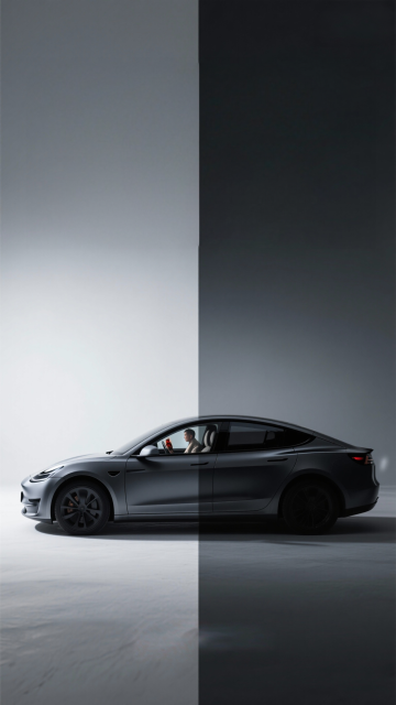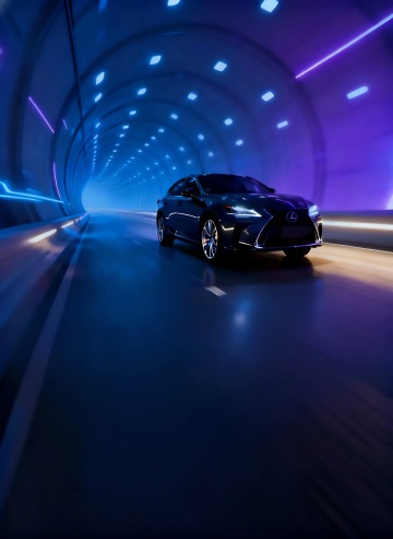 一辆具有未来感设计的轿车,采用深邃的蓝黑色车身,前脸配备锐利狭长的LED大灯和网格状进气格栅,以正面视角处于画面中央。背景为深色夜空与地面的渐变,地面呈现动态的、向中心汇聚的蓝色光带,模拟高速行驶的速度感和运动轨迹。整体画面运用低饱和度的蓝黑配色,光线集中在车头和地面光带上,营造出神秘、科技感与速度并存的氛围,无任何文字元素。
