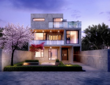 现代简约风格别墅外观,黄昏时分,深蓝色渐变天空,建筑采用水平线条设计,大面积落地玻璃窗透出温暖室内灯光,二层悬挑阳台带玻璃护栏,外墙结合浅色石材与平滑涂料,底部石材墙面纹理清晰,周围环绕修剪整齐的绿色草坪、低矮灌木和高大树木,地面铺设灰色石板台阶,建筑轮廓有嵌入式暖黄色LED灯带照明,光影对比柔和,整体呈现宁静高端的居住氛围,不同样式的现代别墅设计,注重几何感与自然环境的融合。