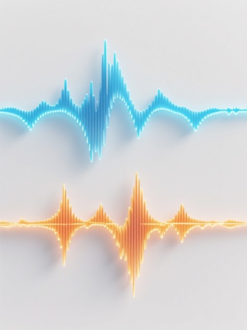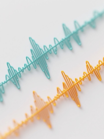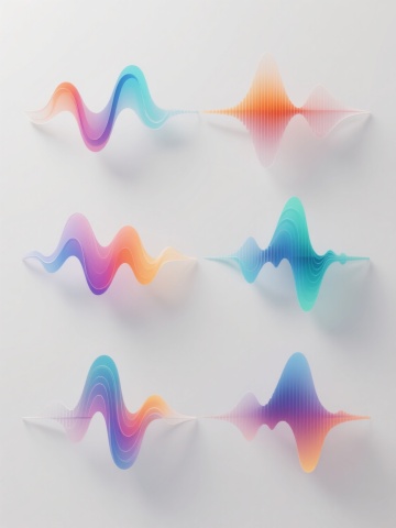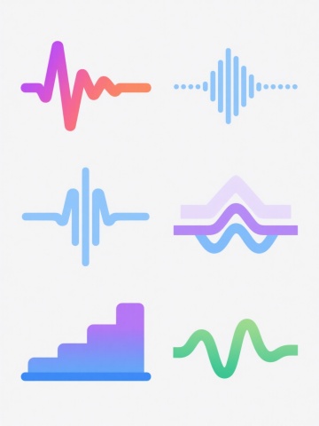 一系列6个完全不同造型的声波元素组成的集合,保持简约现代的设计风格,每个声波均由渐变色彩的线条构成,左侧为粉紫色渐变,右侧为蓝紫色渐变,线条呈现出规则的波纹形态,所有声波元素规整地排列在纯白色纯色背景上,整体构图简洁大方,具有科技感和现代美感。