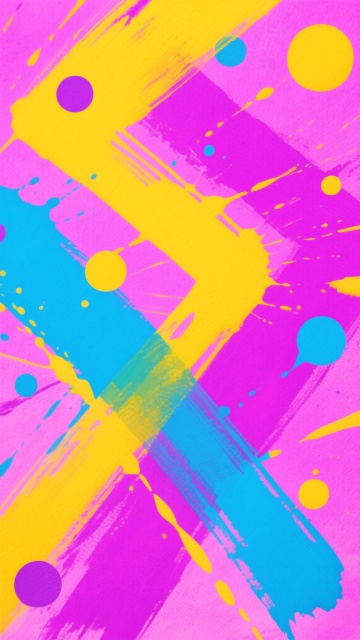 抽象表现主义风格的炫彩背景,以明亮的粉色、紫色和黄色为主色调,融合蓝色和橙色的点缀,呈现出丰富的色彩和谐度。画面采用大胆奔放的笔触质感,厚重的油画颜料堆叠出明显的肌理效果,长而有力的刮擦笔触与飞溅的大小不一的色块、色点相互交织,营造出充满动感和活力的氛围。整体构图饱满,没有明显的视觉焦点,色彩和笔触在画布上自由流淌,形成一种随性而富有生命力的视觉效果。光线表现为均匀的漫反射,使得所有色彩都能充分展现其饱和度和明度,没有强烈的明暗对比,但通过色彩的自然过渡和叠加形成微妙的层次感。炫彩纹路以不规则的曲线和色块分布为主,色彩之间相互渗透融合,既有大块面的色彩区域,也有细腻的色点和线条穿插其中,整体呈现出一种热情洋溢、自由奔放的艺术感觉,适合作为具有强烈视觉冲击力的背景使用。