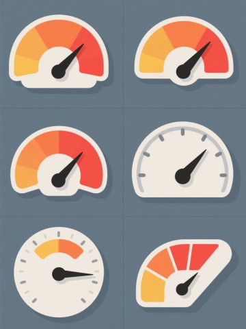 3D立体风格的速度元素系列素材集合,包含6个完全不同造型的速度计图标,每个图标均采用渐变色彩(从蓝到绿再到黄),具有光滑的曲面和清晰的轮廓线条,表盘内有指示刻度和指针,周围环绕着表现速度感的流线型线条,所有元素规整地排布在纯色背景上,整体呈现出简洁、现代且富有动感的视觉效果。
