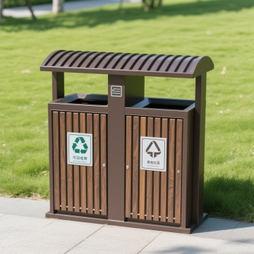4个不同样式、不同配色、不同风格的垃圾桶,白色背景,排列整齐,蓝色可回收物垃圾桶带白色回收标志和文字,绿色厨余垃圾垃圾桶带白色沙漏标志和文字,灰色其他垃圾垃圾桶带白色回收标志和文字,红色有害垃圾垃圾桶带白色叉号标志和文字,垃圾桶下方有黑色轮子,上方有木质指示牌写着“垃圾分类”,整体为简洁卡通风格,色彩鲜明,线条清晰,信息传达明确。