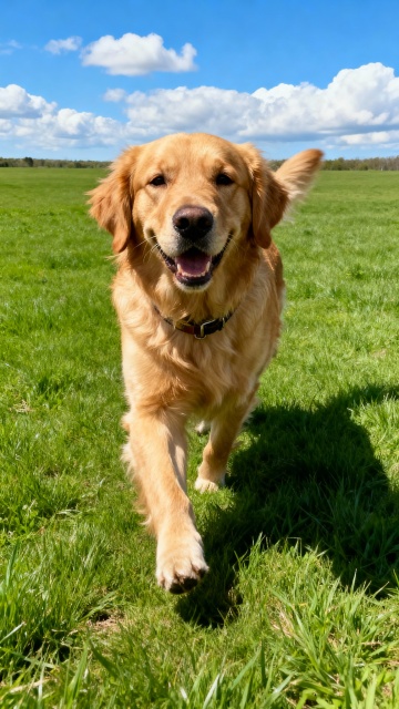 写实风金毛犬奔跑于绿野,光影交错间尽显自然与温馨,毛发生长细腻生动,传递清新舒适与趣味感。