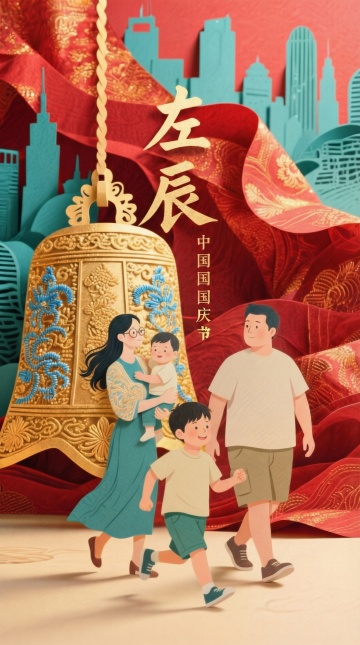 中式感插画风,剪影人物点缀红色牌坊,桃花纷飞,营造温馨节日氛围。