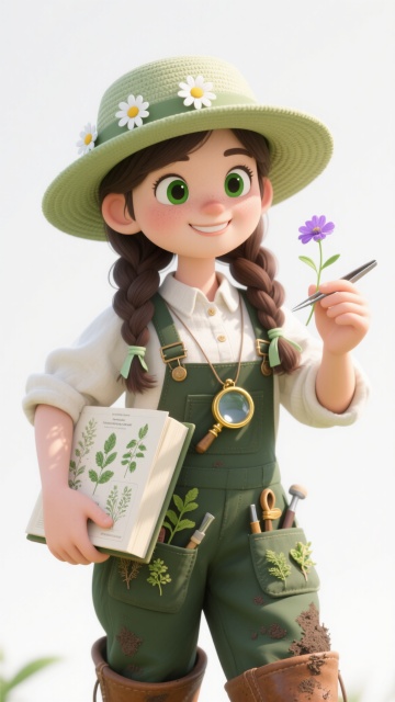 3D卡通风格,一位年轻植物学家,戴着白色宽檐遮阳帽,棕色长发扎成麻花辫垂在胸前,面带温柔笑容,左手托着一株带露珠的绿色蕨类植物,右手拿着放大镜凑近观察叶片纹理,穿着浅绿色工装背带裤搭配白色棉麻衬衫,裤脚沾着泥土,肩上挎着棕色皮质标本采集包,脚穿米色防滑登山靴,腰间挂着多功能工具刀和植物图鉴,手腕戴着棕色皮质手链,整体色彩清新自然,阳光透过树叶在她身上形成斑驳光影,立体感强,细节丰富,人物姿态专注而生动,白色背景突出主体。