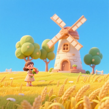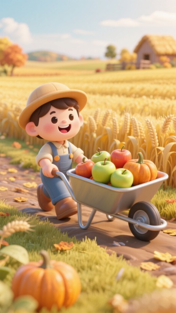 软3D风卡通设计,可爱小男孩推着装满南瓜和苹果的手推车,金黄麦田背景,丰收节氛围。