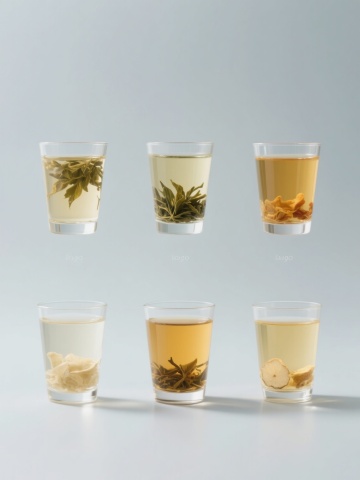 高清晰写实风格的茶元素系列素材集合,六个完全不同的茶相关元素规整排布在纯白色纯色背景上,保持透明玻璃材质的细腻质感和金黄茶水的通透光泽,光影效果统一为柔和的顶部光源,阴影清晰自然。第一个元素:透明玻璃盖碗中盛放着嫩绿的碧螺春茶叶,茶汤清澈;第二个元素:紫砂茶壶搭配四个小茶杯,壶嘴微微倾斜,仿佛刚倒出茶水;第三个元素:透明玻璃公道杯下方摆放着三个不同品种的干茶样本,分别是红茶、绿茶和乌龙茶;第四个元素:青瓷茶杯中漂浮着几朵茉莉花,茶汤呈现淡黄色;第五个元素:黑色陶制茶则中装满了条形的武夷岩茶,旁边放着一把竹制茶针;第六个元素:透明玻璃茶壶中浸泡着普洱茶饼,茶汤呈深红色,壶身上有简约的线条花纹。所有元素保持统一的写实风格和光影处理,整体构图平衡对称,每个元素独立成组又相互协调,形成完整的茶元素系列集合。