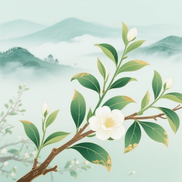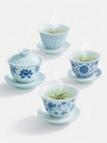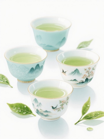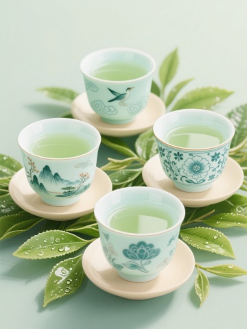 淡雅中国风插画风格,四个不同样式的青瓷茶杯,杯身分别饰有山水、花鸟、书法、缠枝莲纹样,温润通透的白瓷底色,青绿色调清新雅致,柔和的光影效果,杯内盛有淡绿色茶汤,杯口飘散着袅袅热气,周围点缀着新鲜的翠绿茶叶,叶片上带有晶莹的露珠,整体构图疏密有致,营造出宁静自然的茶文化氛围,线条细腻流畅,色彩过渡柔和,具有传统工笔画的细腻质感和现代插画的简洁美感,背景为纯白色。