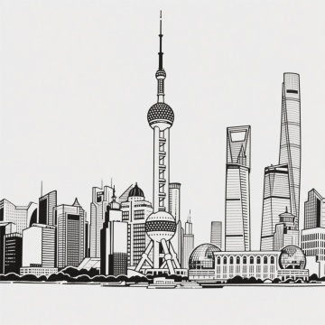 1. 极简线条风格:俯瞰视角下的陆家嘴建筑群,以几何多边形解构东方明珠球体与上海中心大厦螺旋轮廓,蓝紫色块采用蒙德里安式分割,倒影以水平虚线表现,纯白背景凸显色块碰撞