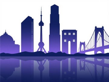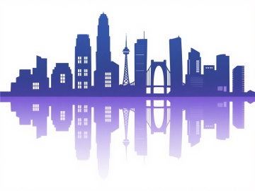 1. 扁平风格的上海城市天际线插画,以渐变的蓝色和紫色为主色调,东方明珠电视塔与上海中心大厦位于画面中央,建筑群采用由左至右升高的阶梯式排列,底部紫色水面倒影呈现对称镜像效果。