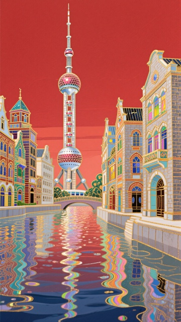 6. 色块堆叠风格:建筑以多层扁平色块堆叠表现立体感,底层色块最深,向上逐渐变浅,东方明珠球体为同心色块环,倒影为色块的水平压缩版本,整体呈现立体书效果