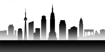 5. 扁平风格的上海城市天际线插画,以渐变的灰色和蓝色为主色调,采用垂直式构图压缩建筑间距,金茂大厦作为画面视觉中心,底部水面用水平粗线条表现,倒影呈现水平错位效果。