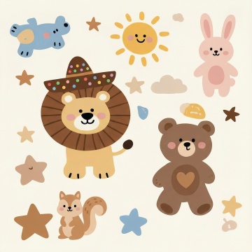 六个不同配色、不同样式的卡通素材,均为可爱Q版风格,角色有着大大的蓝色眼睛、圆润脸型和红扑扑的脸颊,穿着不同颜色和款式的背带裤或服饰,戴着各式动物造型帽子,手持彩色气球,整体线条圆润流畅,色彩明亮柔和,采用白色背景,素材排列整齐有序,保持一致的卡通插画风格和童趣氛围。