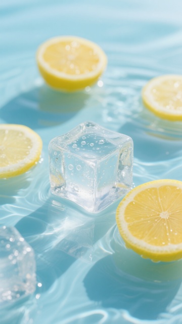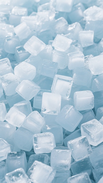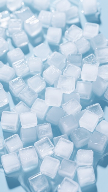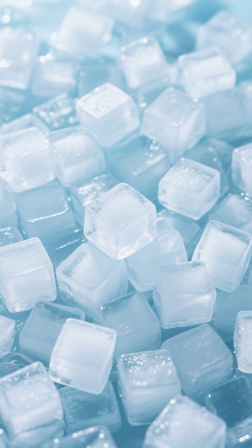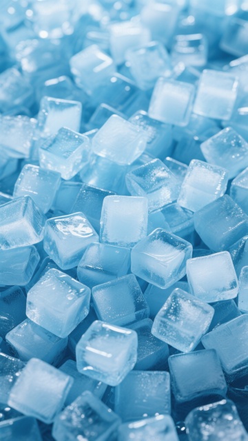 大量透明立方体冰块紧密排列,冰块表面光滑有光泽,带有自然的棱角和细微的冰晶纹理,整体呈现出纯净的淡蓝色调,背景为渐变的浅蓝色,光线从上方柔和照射,冰块边缘有明亮的高光,内部有通透的质感,营造出清凉、洁净、通透的氛围。