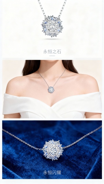 高分辨率珠宝产品展示图,纯白色背景,6件不同款式的奢华银饰整齐排列成系列集合,保持原图的高清写实风格、冷调银色金属质感与璀璨钻石镶嵌工艺,每件首饰均展现精致细节与高光反射效果:1. 经典圆钻网球手链,2. 几何方形切割吊坠项链,3. 密镶钻石耳钉,4. 扭绳纹镶钻戒指,5. 双层叠戴式钻石手镯,6. 马眼形宝石吊坠锁骨链,整体构图平衡对称,突出珠宝的高贵光泽与精湛工艺。