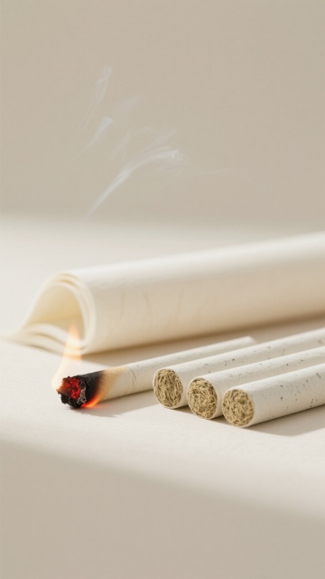 极简主义风格的艾灸主题静物摄影,柔和的米白色背景占据大面积留白,营造出宁静、洁净、禅意的氛围。画面左侧有一卷微微卷起的米白色宣纸,纸张边缘自然弯曲,展现出细腻的纸质纹理。宣纸前方偏左位置放置一根正在燃烧的艾条,艾条底部有黑色的燃烧灰烬,顶端可见红色的燃烧火星,火星周围呈现渐变的橙红色调,散发着温暖的微光。右侧水平横放着三根未燃烧的艾条,艾条呈圆柱形,表面为米白色并带有细小的深色纹理,顶部切面可见细密的艾绒纤维结构,三根艾条相互平行且略有交错,形成稳定的视觉平衡。整体构图遵循三分法,主体元素集中在画面下方,上方留有大量空白,光线为柔和的顶侧光,阴影浅淡自然,色彩以统一的米白色和艾条的自然本色为主,整体画面简洁、雅致,信息传达清晰,突出艾灸的自然、传统与疗愈感,具有极高的设计感和视觉舒适度。