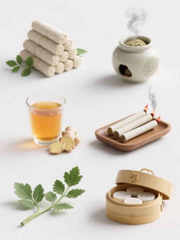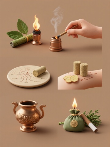 3D立体风格养生系列素材集合,纯色背景,规整排布六个完全不同元素内容,均为艾灸及养生类目,每个元素都具有清晰的3D质感和立体感,包括:1. 传统铜制艾灸盒,带有镂空花纹和燃烧的艾柱,顶部有袅袅升起的烟雾;2. 手持艾灸条正在进行艾灸操作的场景,手部姿态自然,艾灸条前端有明火和烟雾;3. 一本翻开的中医养生古籍,书页上有艾灸穴位图谱,旁边放置着一小捆艾绒;4. 几个不同规格的艾柱和艾条,整齐排列在托盘上,展现出不同的形态和纹理;5. 一个装满艾草的陶罐,罐口有艾草溢出,旁边放着一个用于捣制艾草的工具;6. 艾灸穴位模型,人体穴位处有高亮显示,旁边放置着一根艾灸条,整体设计简洁明了,突出养生主题,具有统一的视觉风格和设计感。
