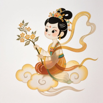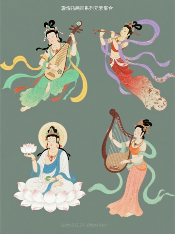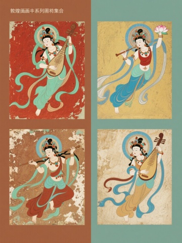 一组四幅规整排布的敦煌壁画风格系列素材,每幅均为纯色背景,保持唐代壁画特有的矿物颜料质感、古朴褪色效果、流畅飘逸的线条和装饰性图案风格。画面整体色彩分别变换为:1. 青绿色调为主,描绘反弹箜篌的伎乐天,身着青绿缠枝纹长裙,飘带呈淡蓝与白色;2. 赭红色调为主,展现吹奏笙箫的飞天,衣饰为赭红与明黄,点缀金色纹饰;3. 石蓝色调为主,刻画手捧莲花的供养菩萨,身披石蓝与月白袈裟,莲花为粉白渐变;4. 土黄色调为主,呈现手持琵琶起舞的乾闼婆,服饰为土黄与赭石色,飘带为浅褐与米白。所有人物姿态各异,均保持敦煌壁画的典型造型特征、面部神态和传统纹样,元素类目统一为佛教伎乐天/飞天/菩萨形象,整体构图平衡对称,四幅画面风格高度统一,仅通过主色调和所持乐器/物品形成区分,构成系列感。
