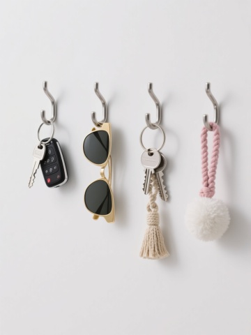 超写实3D渲染的四把不同样式金属钥匙,包含扁平矩形钥匙牌、传统齿纹钥匙等,银色金属材质表面有细腻反光和轻微磨砂质感,黑色圆形钥匙圈连接,整体以对称平衡的方式整齐排列在纯白色背景上,光线从左上方45度角照射形成柔和阴影,突出钥匙的立体感与材质细节,画面简洁干净,具有产品展示级的清晰锐利度和专业静物摄影的光影氛围。