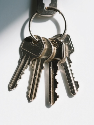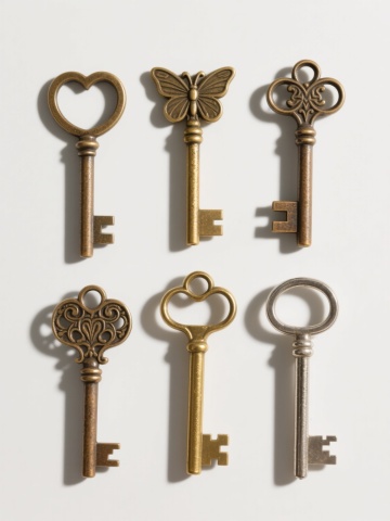 4把不同样式的金属钥匙,每把钥匙都具有独特的齿纹和形状设计,钥匙表面呈现出真实的金属质感,带有细微的划痕和反光效果,钥匙通过一个圆形金属环串在一起,整体以垂直方向整齐排列在纯白色背景上,光线从斜上方照射,在钥匙下方形成柔和自然的阴影,画面清晰锐利,构图简洁,突出钥匙的细节和金属材质感。
