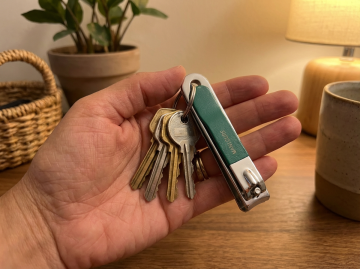 超高精度摄影风格,白色纯色背景,四把不同样式的金属钥匙通过银色钥匙圈整齐排列,每把钥匙均展现出真实的不锈钢金属质感,包括清晰的拉丝纹理、边缘锐利的齿牙结构、钥匙柄上独特的雕花图案和凹槽设计,光线从左上方45度角照射,形成自然的高光反射和柔和阴影,整体构图居中对称,钥匙间保持均匀间距,呈现出干净利落的产品展示效果,细节丰富,金属光泽细腻,无任何文字或装饰元素干扰主体。
